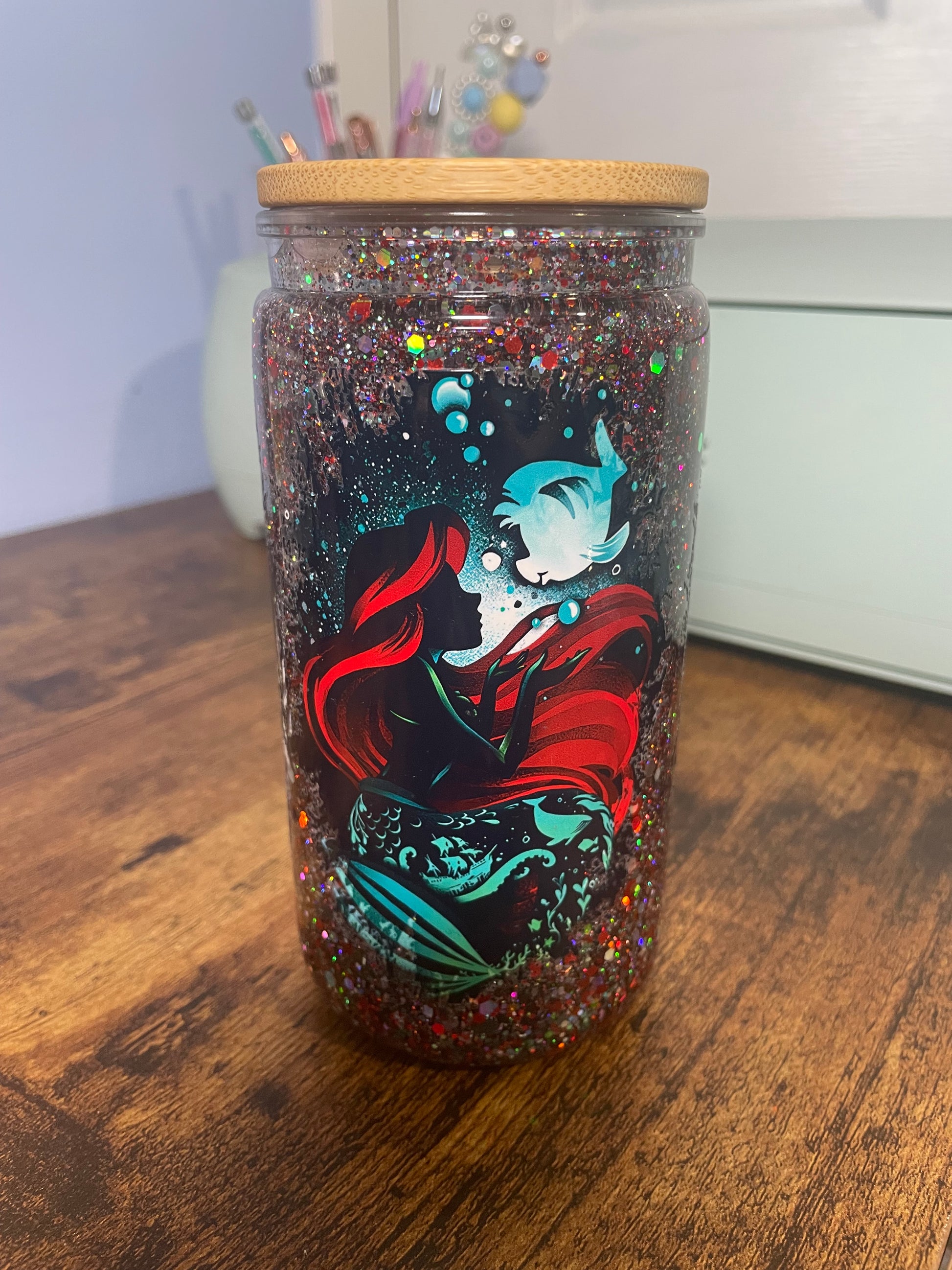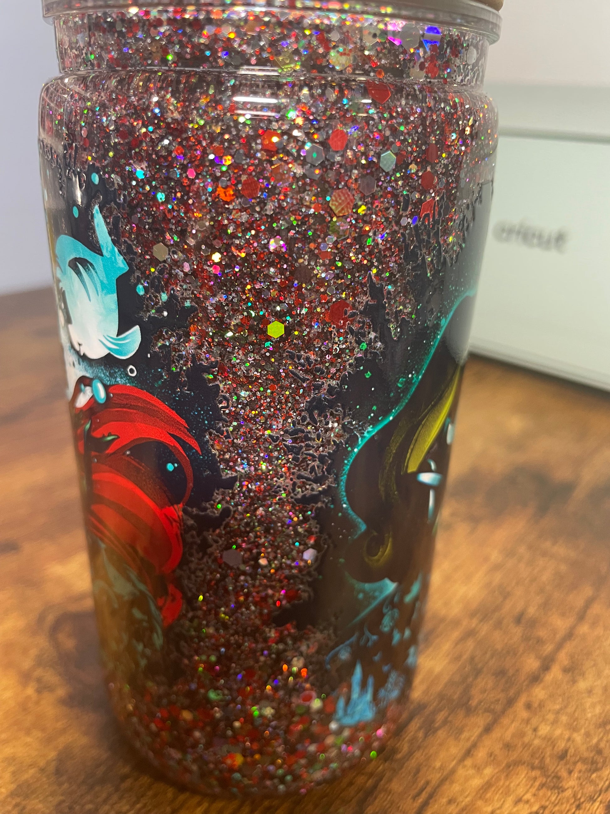 Make every sip an enchanting experience with our 16oz snowglobe tumbler. Watch as glitter swirls and dances with every movement, turning your drink into a mesmerising, sparkling spectacle. It's a fun and functional piece that keeps your cold drinks frosty and your day magical.