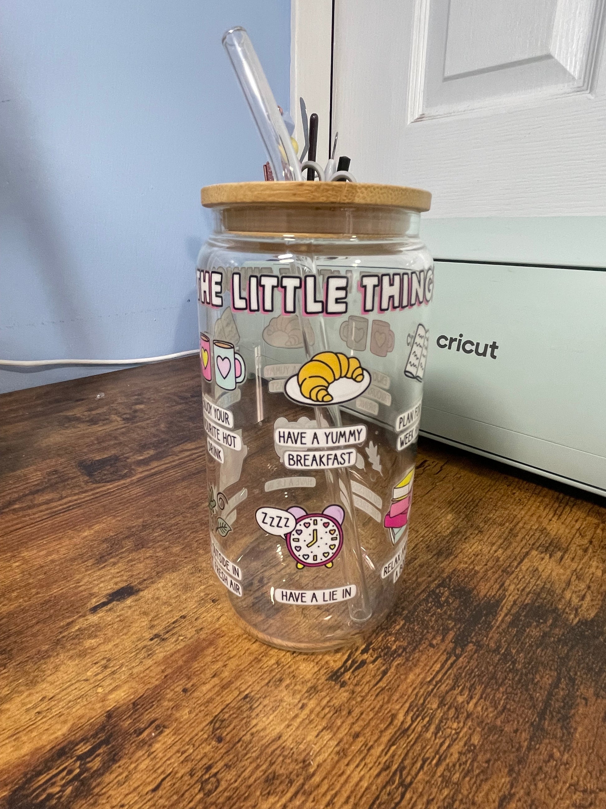 ✨ Meet the overachiever of drinkware: a 16oz glass can with a bamboo lid. It’s like your latte’s new best friend, your iced tea’s forever plus-one, and your cold brew’s hype man. The glass keeps things lookin’ crisp and classy, while the bamboo lid is basically saying, “Yeah, I’m sustainable AND stylish—jealous?” 🌱